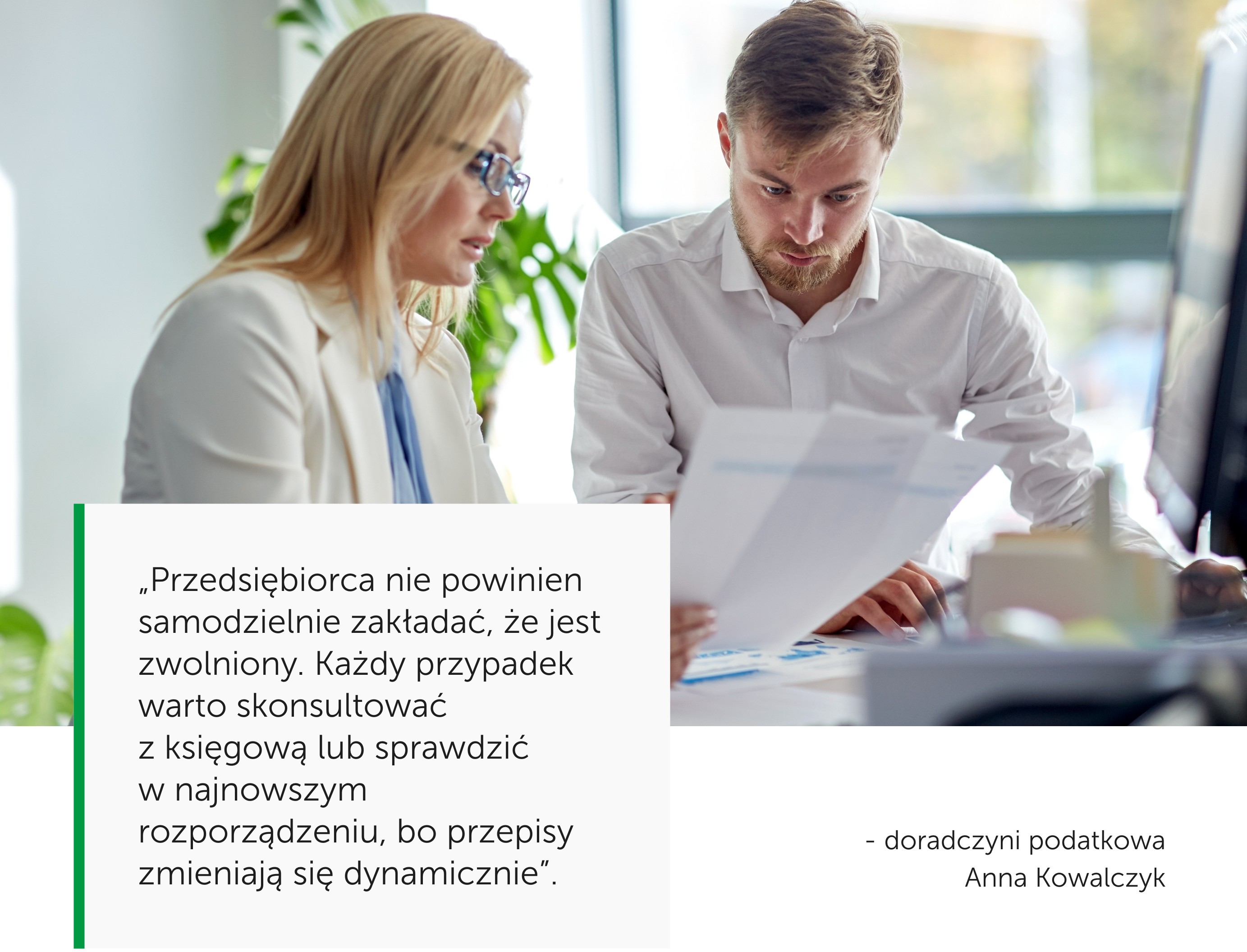 Jak podkreśla doradczyni podatkowa Anna Kowalczyk: „Przedsiębiorca nie powinien samodzielnie zakładać, że jest zwolniony. Każdy przypadek warto skonsultować z księgową lub sprawdzić w najnowszym rozporządzeniu, bo przepisy zmieniają się dynamicznie”.