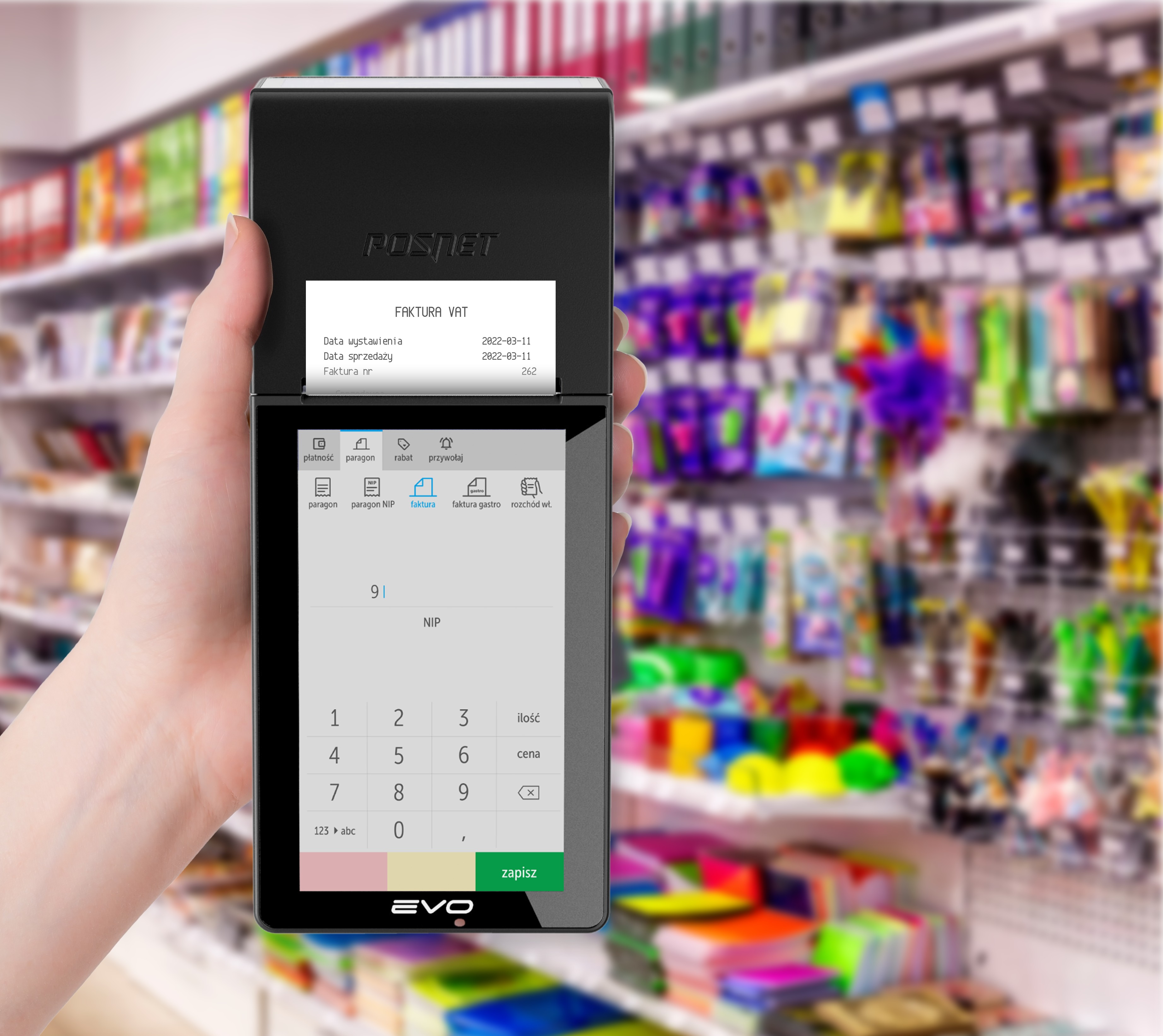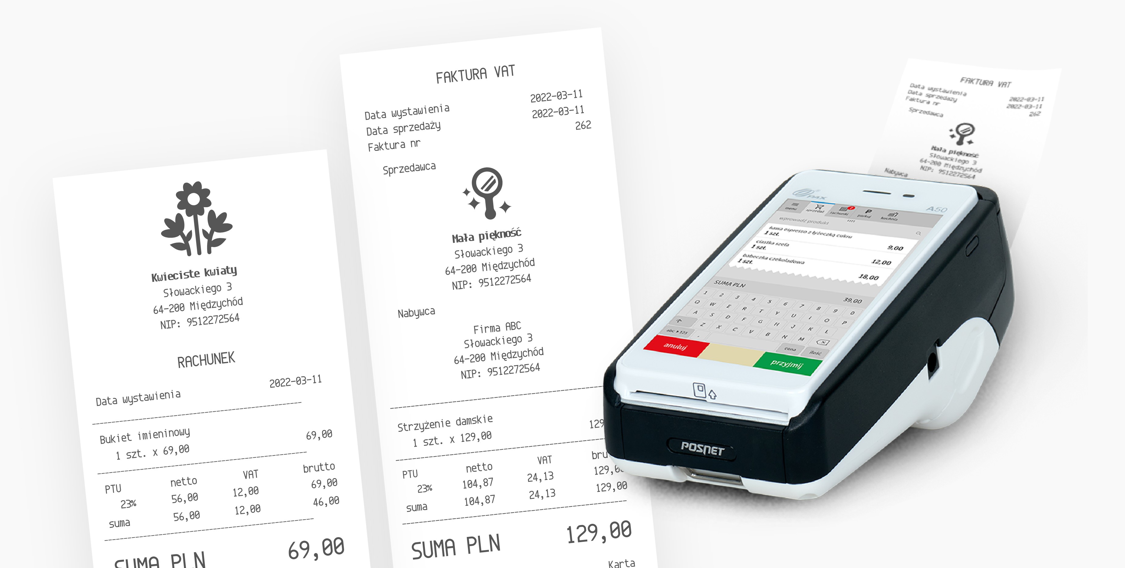 Kasoterminale od twórcy tych urządzeń na rynku polskim, firmy iPOS nie tylko drukują paragony, paragony z NIP czy faktury VAT ale też np faktury gastronomiczne. Co więcej, ponieważ kasoterminale mają wbudowaną łączność nie musisz wpisywać danych klienta do faktury. Wystarczy że wprowadzisz NIP a kasoterminal sam pobierze dane klienta z REGON i wydrukuje odpowiedni dokument.